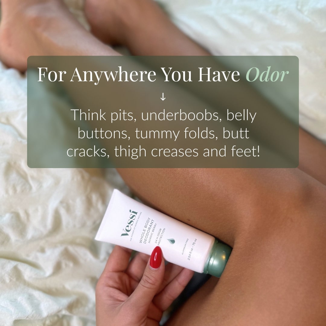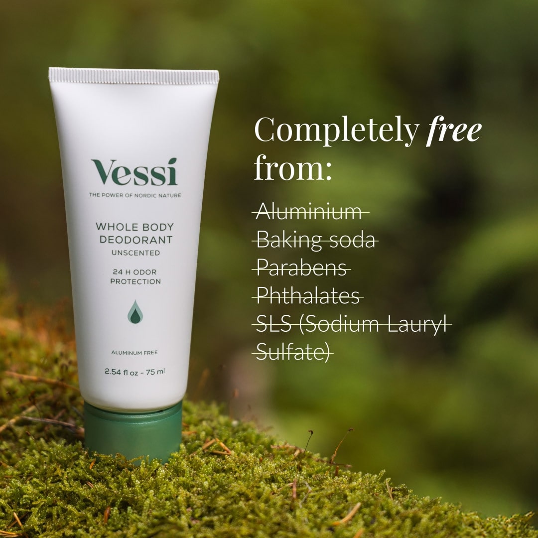 Vessi celotelový dezodorant sa dá použiť aj pod prsiami, v brušných záhyboch, za ušami – alebo kdekoľvek, kde pociťujete nežiaduci telesný zápach.